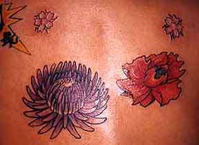 There's this crazed psychotic Asian punk rock riot grrl I know from online, her name's Megumi, right?... she terrorizes her current hometown of San Diego as part of the all grrl band 'Panty Shots', & likes to name drop either the different infamous punk legends she's bedded or the infamous malt liquor brands that she's drank into extinction. Who would've known that she was serious when she said that she would fly out to get ink??? She greeted me with a running jump & hug, & we were instant friends. We had a great time running around the city, I taught her how to be a real New Yorker, & she got many pictures of herself with the New York Police Department... The purple in the chrysanthemum matches the bangs of her hair, & she vows that she will be back in March for more, maybe touring with her band, maybe fleeing from the feds,... can you say extradition? All this & she's a sixth grade teacher,.... |