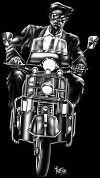R.S. Sauer & I decided to shoot a bunch of ruder than you type stuff out to Moon Records president & lead singer of The Toasters, Rob "Bucket" Hingley, since two tone is the color of our souls, & Buck chose this piece to be printed as the new Moon Records logo shirt, with this rudy on the front, & their logo on the back, & looks damned smart on an ash ringer with black sleeves & collar... I envisioned it on black, like I envision everything on black, but I digress! I wanted to do a lot more for them & all the collected bands, but I spilled my bike all over Greenwich Street coming out of the Fourth of July Scofflaws show @ the Wetlands, & took my right arm out of commission for two full months!