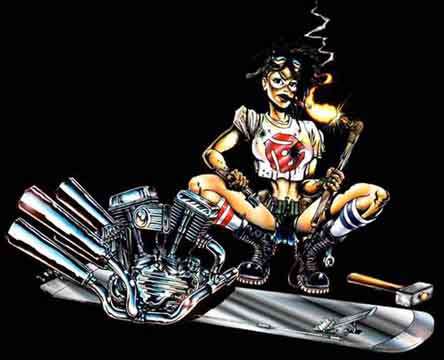 OK, kids, figure out who this one was for... I'm not big on NASCAR, too many damned wheels on those things! Windshields are for sissies! This amalgamation was done before they even poured the foundations for this Myrtle Beach monstrosity, for shirts & screen printed grand opening posters, so rather than use photo reference, the artist's architectual renderings were used for background layouts. Even the cars are pieced together like mad, one is hand drawn & airbrushed, one is a manipulated photo, & one is a fully rendered, photo realistic,vector based Illustrator file!