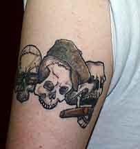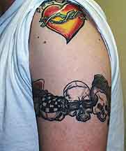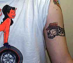 See? See how I can keep a promise? This is my buddy Dave, an original rudie from Kingston,... uhm, Kingston, New York, that is,... & as you can tell, he has a hell of an eye for a good piece of art! The inkslinging was done by our mutual good friend R.S. Sauer, who is doing some incredible work considering he's basically a neophyte. Dig that Sacred Heart, with all that intricate coloring, more like paint strokes than tattoo fills,... that was Bob's first tat! Doesn't it make you sick? The bastard! I can't wait to get up there with my new gun, & scratch a giant 'Thief' signature across his big ass!