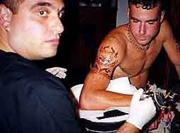 Me slinking ink, Staten Island, New York, on a marine stationed on the west coast, visiting on shore leave, taking in the sights in NYC, up at Woodstock 99, & stopping by for some fresh scabs on his shoulder. Scary, that this individual is the country's first line of defense,...