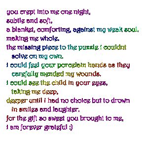 Lauren's this extremely sweet girl from Southern California, who says a lot of touching things. Our greatest connection is that we're both "music whores" (to quote Hellebelle)...we're extremely obsessed with it and buy more CDs than we really should. Lauren's only just old enough to drive and she's already had a gothic song written about her! Pretty amazing, huh? The song is "Sister Sin" and written by a gothic band in Michigan that broke up in 1998. This inspiration rubs off on the people she meets, because she's extremely sweet and self-afacing. She's an angel to her friends and will open her home to anyone who needs "Shelter from the Storm" (to quote Bob Dylan). Her inspiration is also found in that she's extremely creative. I got a package in early October of 1998 from her that just blew my mind. She went all out on this thing! I knew she was going to make this artistic letter for it and I told her to make it EXtra special, so that it would be worthy of framing. Amazingly enough, she made it something you could frame and sell at an art show! This letter had black paint covering most of it and dripping down on the bottom. She signed the white area at the bottom of the paper and wrote on the black paint with a silvery pen more of a poem, then a letter. Lauren's also my industrial/gothic music teacher and sent me a tape of just a few of her favorites songs. She loves pumping bassy dance industrial music. Just to give an idea, here are the contents of the tape: