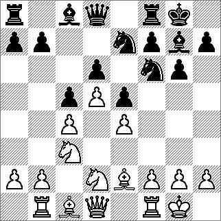10... a5. 11. a3 Nd7. 12. b4 ab4. 13. ab4 b6. 14. bc5 bc5. 15. Nb3 f5. 16. f3 f4. 17. Bd2 g5. 18. Be1 Nf6. 19. Ra1