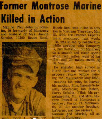 This page is dedicated to my loving brother who is missed very much. He was killed in action in the Vietnam War. He was a United State Marine. He was killed by hostile fire while serving with company G, 2nd Battalion, 5th marines on a search and clear operation five miles west of An Hoa and 20 miles South of Da Nang.I have been looking for anyone that might have served with him in Vietnam so that I could learn more about my brother becuase I was very young when he left to go to war.His name is PFC John L. Schultz.