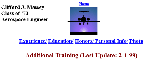 ŸAdvanced EXCEL, 1996 ŸEXCEL 5.0 (BASICS), 1996 ŸEqual Opportunity 2000, 1996 ŸUSAF Military Personnel Management Course, 1996 ŸAcquisition Reform, 1995 ŸCapitol Hill Workshop, 1995 ŸSystems Engineering, 1994 ŸAcquisition Logistics, 1994 ŸCivilian Leadership Seminar, 1993 ŸSecurity Assistance Management CONUS Orientation Course, 1993 ŸAcquisition Planning and Analysis, 1992 ŸIntroduction to Acquisition Management, 1992 ŸTotal Quality Management (TQM) Team Building, 1991 ŸTQM Quality Leadership for Managers, 1991 ŸCivilian Personnel Management Course, 1990 ŸSupervisor Safety Course, 1988 ŸI-DEAS Supertab/MSC NASTRAN, 1987 ŸVAX/VMS Utilities and Commands, 1986 ŸNASA Structural Analysis Beginner's Course, 1985 ŸKelly Management Association Leadership Seminar, 1984 ŸIntroduction/Familiarization to Advanced Composite Materials, 1983 ŸDamage Tolerance Analysis, 1981 ŸBasic Principles and Practical Aspects of Finite Element Analysis (Videotape), 1981 ŸFracture Mechanics for the New Practitioner, 1980 ŸMetal Fracture and Fatigue, 1979 ŸLogistics Support Analysis Process Course, 1977 ŸApplied Interactive Computer Graphics, 1977