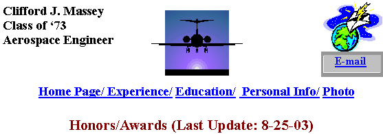 ŸSuperior Performance Award, 1995-2003 ŸTime-Off Award, 2002 ŸNotable Achievement Award, 2000, 2002 ŸCertificate of Commendation, 1997 ŸTime-Off Award, 1997 ŸAbove & Beyond Award, 1996 ŸTime-Off Award, 1996 ŸCertificate of Appreciation, 1993 ŸLetter of Appreciation: Canadian Trade Mission, 1990 ŸSustained Superior Performance Award, 1985-1988 ŸCertificate of Appreciation: MMS Employee of the Month, October 1987 ŸAIAA Special Service Citation, 1985 ŸQuality Salary Increase Award, 1984 ŸLetter of Appreciation: Major General Frederick J. Dau System Manager of the Year Award Nominee, 1984 ŸLetter of Appreciation: Arthur S. Fleming Award Nominee, 1984 ŸLetter of Appreciation: AIAA Support, 1984 ŸLetter of Appreciation: T-38 DTA/ASIP Engineering, 1984 ŸSustained Superior Performance Award, 1983 ŸCertificate of Appreciation: MMS Employee of the Month, February 1983 ŸCertificate of Appreciation: MMS Employee of the Month, February 1979 ŸLetter of Appreciation: PATRIOT Missile System Support, 1978 ŸLetter of Appreciation: PATRIOT ILS Modification Proposal Evaluation Team, 1978 ŸCertificate of Achievement: Suggestion Award, 1978 ŸAIAA Bendix Design Competition Award, 1973