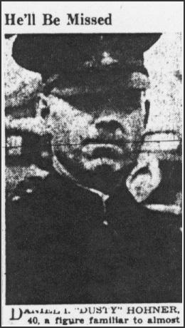 Daniel I. "Dusty" Hohner, 40, a figure familiar to almost every resident of the city, who died Monday afternoon at 5 o'clock in the Stratford General Hospital. Dan had been seized with a paralytic stroke Thursday evening and failed to recover from it. He lived at 300 Albert street with his mother, Mrs. Isabel Hohner.