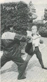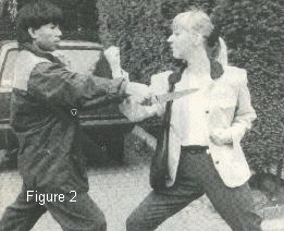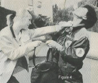 Avant-bras et bras sont repliés sur la poitrine, formant un angle aigu. L'avant-bras se déplie totalement jusqu'à être dans la parfaite prolongation du bras. Ce mouvement permet de vous défendre si on vous attrape le poignet. Par contre, si le voleur tire sur les lanières du sac que vous tenez en main, vous avez plutôt intérêt à frapper son pouce. Mais là , on rentre dans les mouvements offensifs. Après avoir esquivé le coup ou s'être défendu, il faut le plus souvent se débarrasser de son adversaire ou se donner la possibilité de fuir.