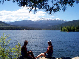 Dennis got a picture of us sat at the water's edge. We could see a sandy beach across the way and thought we should all go take our inner-tubes for swim.