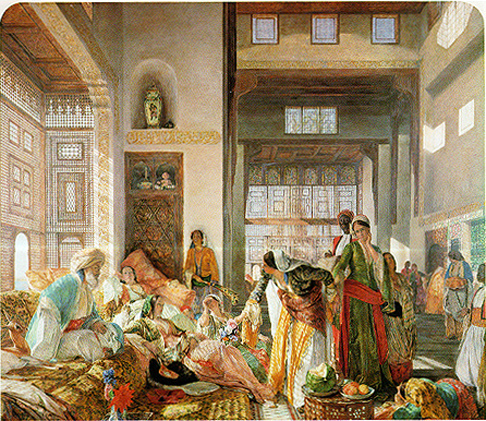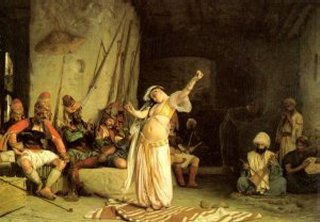 | Note that the pictures you find here on my page are largely the result of the Orientalist artists. These artists traveled, most often in secret (one famous artist traveled in the guise of a deaf and dumb local), among the populous, documenting on canvas that which they saw of interest. As one might imagine, the images captured by young Western males in the chauvinistic world of the 18th and 19th centuries were prone to the tittilating themes of sex and war, and that is frequently what you will find among the topics represented in this genre. The women are not often found fully clothed, and there are images of slavery and war throughout. | |||||||||||||||||||||||||||