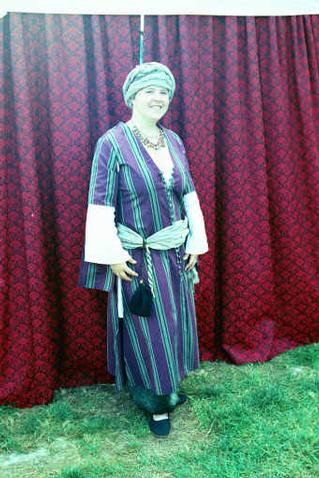 | Above: Dressing up for fun on hafla night at Oasis Dance Camp West 2000. My friend Ziva was kind enough to pose me and take this great photo for me to have! Right and Far Right: A comparison of some Medieval Middle Eastern garb I made alongside a rendering of similar garments. As you can see, I opted to make mine with a longer hem, but with shorter dropped sleeves (I still manage to dip and spill with this length sleeve!)  |