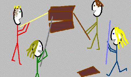 The Super Schmazz Box Game is a game we came up with while spending Halloween (1998) weekend at 'The Beach House'. It started with Caleb and me hitting a box back and forth, trying to scare Sam. Pretty soon Sam and Nate joined in, and this game was born. First, you need to be in a spacious, yet closed in area. Like a garage. Then, everyone gets a broom or mop, and used the handle as their hitter thingy. Select a box thats nice, new, and pretty. The object is to keep it in the air, and hit the other people with it, without poking their eyes out. Do this until the box can't be lifted off the ground anymore-like a piece of withered paper. Prepare to get thirsty! And sweaty...