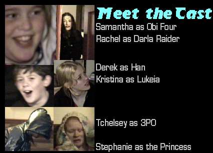 When the Special Editions of the Star Wars Trilogy came out, we decided to do a parody of it. In the pictures you will notice that Nate and Caleb aren't in any of them. Well, this was made after Nate, Rach, and Cabe moved to Redmond. Rachel was in Springfield for Sam's birthday. Anyway, this movie was made after Star Wars had come out in the theater. Rachel was the only one who had actually seen the whole trilogy, so the rest of us had to act based only upon "A New Hope". I guess we wanted the first time (to see Star Wars) would only be right in the theater, big sound, new scenes. When we saw either the second or third one, we were in the third row, on the side. Needless to say, Stephanie made a few trips to the bathrooom, bidding farewell to all that candy she had. But back to our parody. Without further adu,here are some pictures: