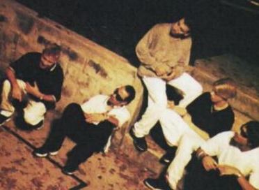 An older shot of the group in black and white