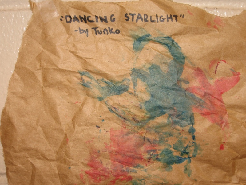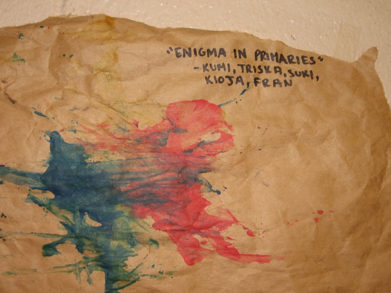 Occasionally, they would give their gorillas non-toxic fingerpaints and see if they felt like painting. We do it sometimes, too. But we don't have awesome titles for our gorillas' pieces. These were hanging up in their keeper office.