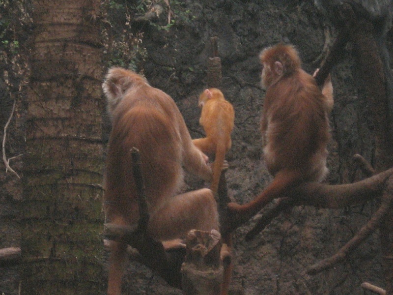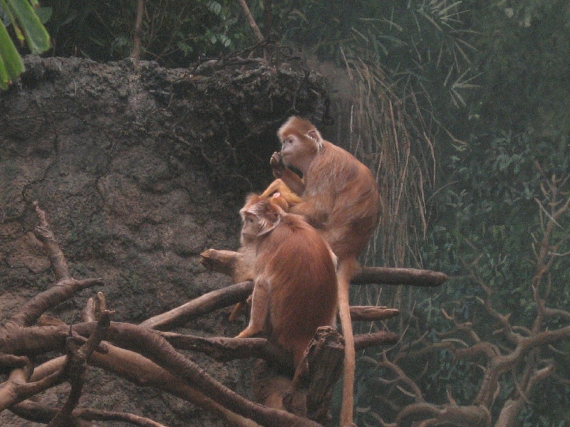 They're actually ebony langurs, which normally are all black. These animals descend from a population that just happens to be reddish-brown. They also had several that actually were black. It's normal for their babies to be orange.