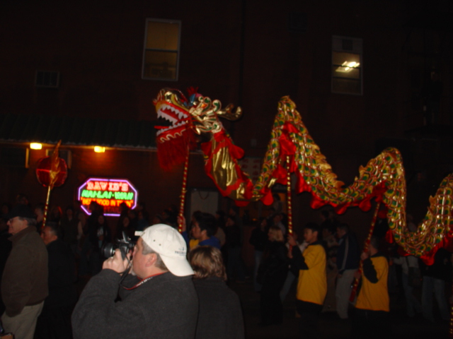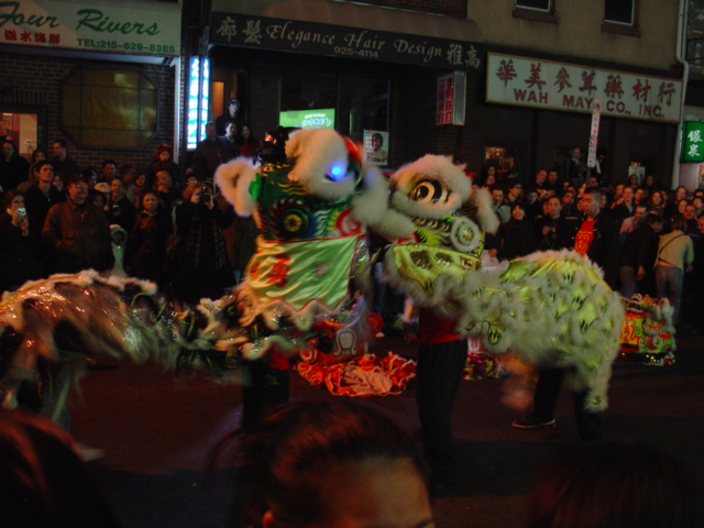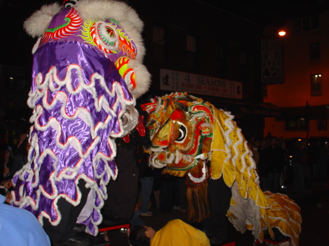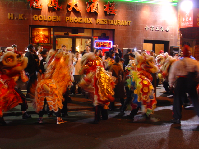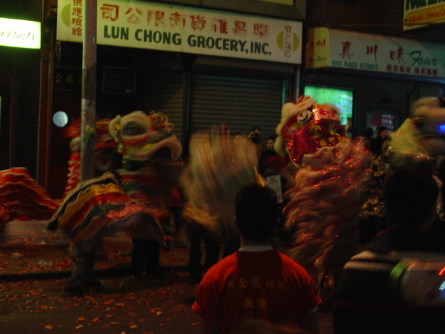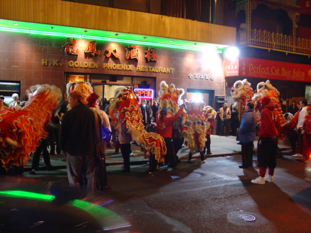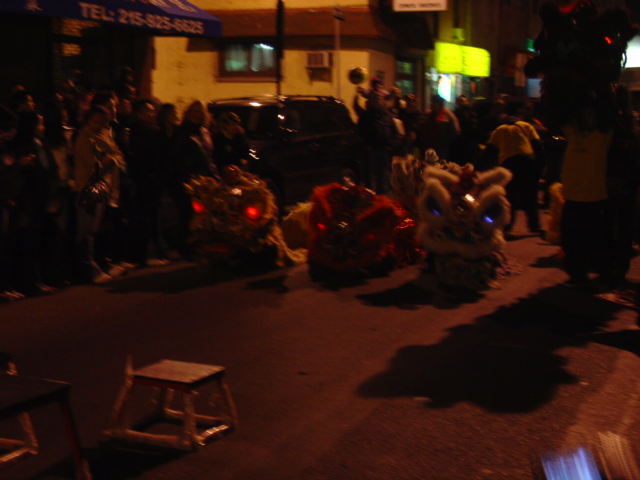 I got there plenty early - not knowing how crowds would be or where the parade route would go. I had an intersection and a start time. I get there and there is absolutely nothing going on. No streets are blocked off, plenty of traffic, a few small groups of people hanging out here and there (including a handful of very caucasian college-aged males with "gatorade" bottles, acting very not sober and screaming out "happy new year!" every ten seconds.) I walked around. I did laps. I didn't want to look like a tool standing on the street waiting for something to happen. After some time I heard some kind of music going on, but it was several blocks away from the intersection listed for the parade - I gravitated toward the noise until I came upon a group of kids banging on some percussion instruments. Then more came out with some of those lion costumes you see in the news or on TV and started moving. But they were just carrying them down the sidewalk, single file. I followed. Other people were doing the same. They eventually arrived in front of a restaurant.