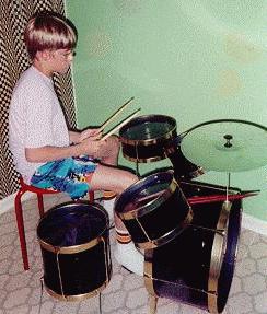OB with his first (um, and last) drum kit! Black Magic in the house! I musta been only 12 or so, but I had the infamous red sticks even back then... I honed my skills (?) to Guns-n-Roses