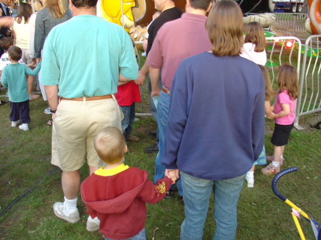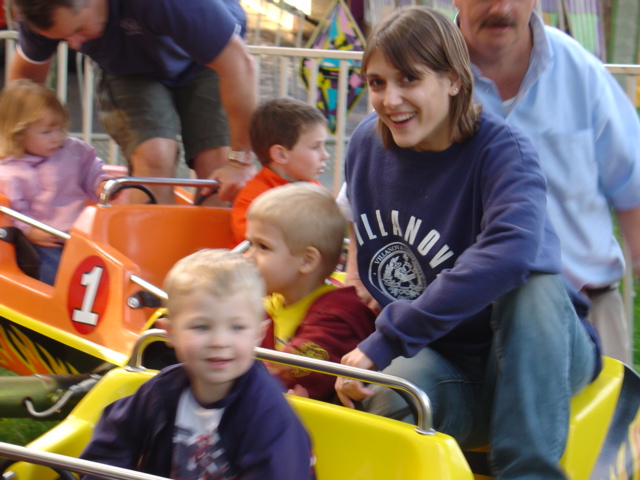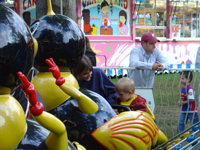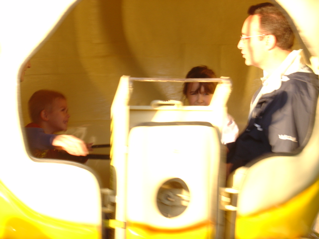 Our first ride was the bumblebee. It goes up and down while it goes in circles. That seems to be the theme of these rides. This theme makes my stomach curdle. Steph and Tristan strap in.