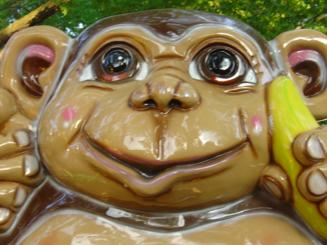I'm not about to ride in any 12-foot tall, glossy-eyed monkey who impales a banana into his cheek like that.