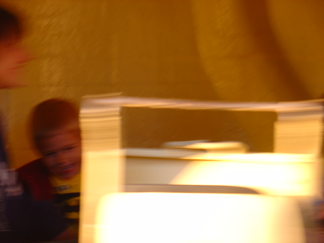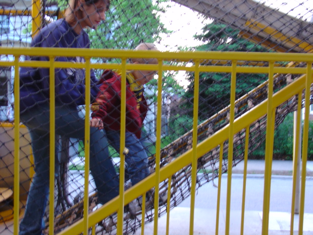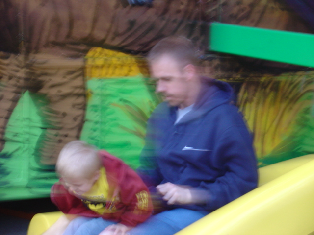 And slide down at the end. I can't tell you how proud of this picture I am. Notice how blurry it *isn't*. I lost track of where they were in this obstacle course thingy and realized I could get a shot of them coming down the slide, so I'm running to the end of the thing with my camera just turning on and I point and shoot just as I stop moving at the very point that they're coming down the slide. It all happened in about 2 seconds and I can't believe how good the picture is. I love it.