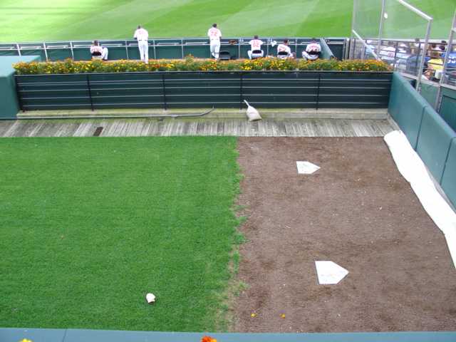 The rain showed up again briefly after we got to our seats, which were second level but still pretty good and under a semi-roof! The grounds crew pulled out the infield tarp.