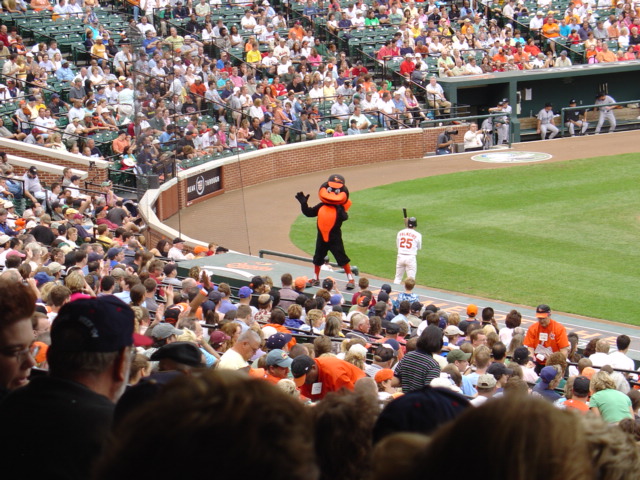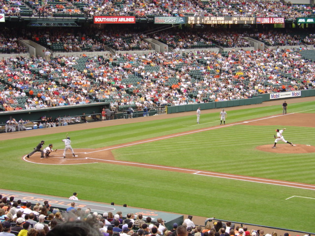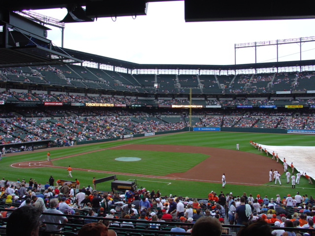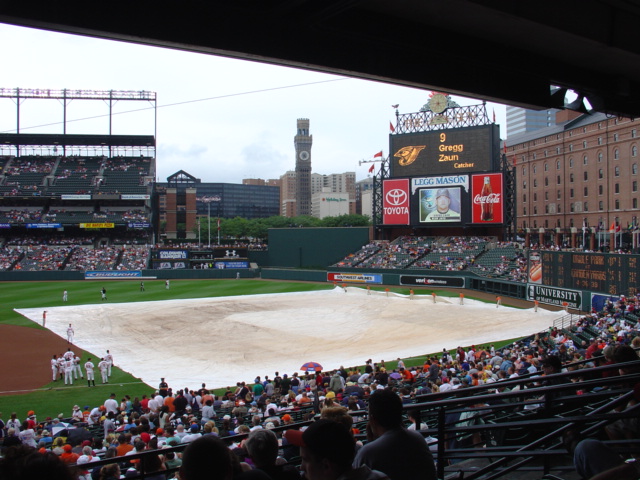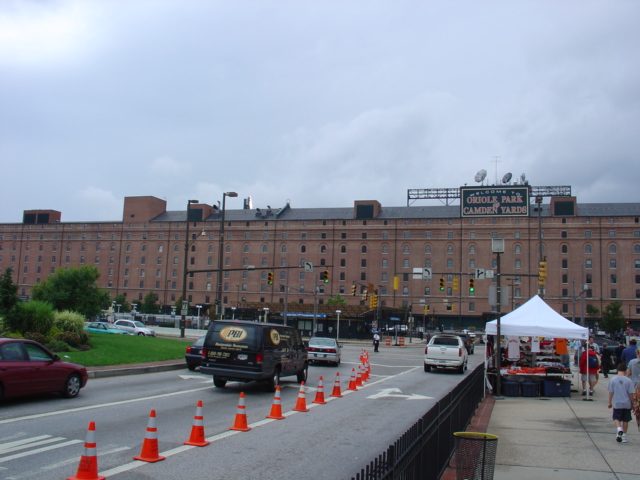We got in severely late after the Yankee game and we had to get up at a semi-decent hour to get to Baltimore. Not for the game, which was mid-afternoon, but to meet up with two different sets of local friends/family. It wasn't easy, but we made good time. Traffic was good on *our* side. When we got there we were to meet up with two of Mike's cousins and my pal Christina. I called X-tina a few times but when she finally called me back, she was still quite groggy from a late night of bartending. So she backed out, which was a bummer, but it was all good. We met up with Mike's couzins as planned at a cool little bar & grill right near Camden Yards. Had some grub, hung out and then went to some crazy packed sports bar for some more beer (but they had plenty of beer at the restaurant?). Anyway, Mike's fam was super cool, one cousin was female and rather attractive, and it was a pleasure to hang out with them. It was raining pretty hard off and on before the game and we wondered if it would even go on as scheduled. It tapered off right as gametime approached and it was good to go when we walked in. Still overcast, but it would brighten up substantially later on.