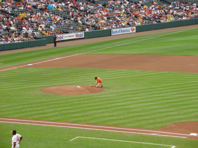 I'm not sure what this dude was doing, but he was hammering something into the back of the pitcher's mound. The mound guy. Maybe it was something for the pitchers to kick their cleats on to get the mud off?