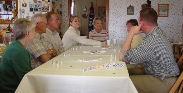 Here's a killer shot of the Curry clan doing what they do best. Playing dominoes. L-R : Grandma, Grandpa, my dad, cousin Lindsay, Aunt Penny, Aunt Becky, Uncle Lyle. Easter 2004. We are all very caucasian.