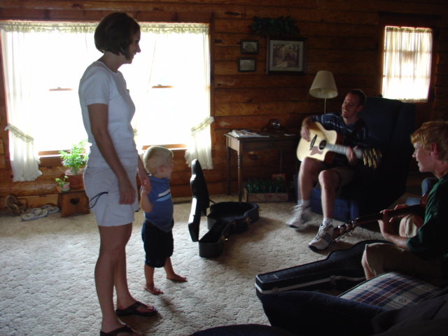 Cousin Jeni and Tristan watch as Nic and I rock the house. Well, rock the Aunt Becky's house. July '05.