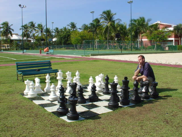 Back at the sports complex, they had this HUGE chess set... there was one at the pool, too but it was missing a pawn (filled in by a large orange street cone). At that very instance (for the first and last time) I was disappointed Steph didn't play. But I had to pretend. Steph rolled her eyes but took the pictures, anyway. What a good wife.