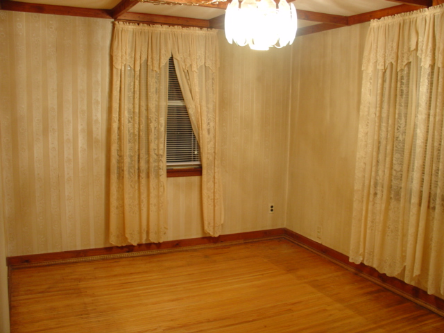 Oh, my. Tristan's room, pre-cleaning/painting/sandblasting. This was a long, long haul. We started off having a really hard time getting that wallpaper off. It was two layers and the original stuff had to have been from the 50's. The whole thing just looks yellow-dirty, doesn't it? Some of that is from the light, and the wallpaper is really supposed to be that kind of light beige color, but it was pretty filthy, too. So we finally got all that wallpaper out, and painted it, and painted Tristan's chest and armoire to match, and put in new curtains and a large room rug, and voila!