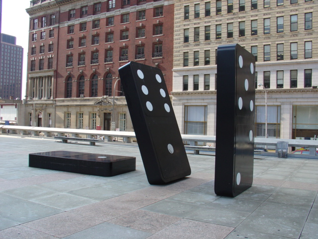 There's a plaza across the street, north of City Hall called Thoman Paine Plaza near the Municipal Services Building. I call it Gamepiece Plaza - there are Sorry gameboard pieces, Monopoly pieces, chess pieces, bingo markers & dominoes. They're huge. And awesome. I believe collectively they're called "Your Move" and were put there in '96. The artists credited are Daniel Martinez, Renee Petropoulis and Roger White.