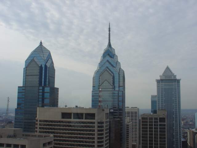 You can see my camera in the middle of the building on the far right. I actually didn't even notice that until several months after I took it. The tallest three buildings in town. Two Liberty Place, One Liberty Place and the Mellon Bank building. July '04.