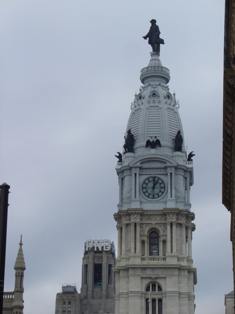 An up-closer shot of William Penn atop City Hall, taken from what I call "Game Piece Plaza" but which is actually Thomas Paine Plaza.