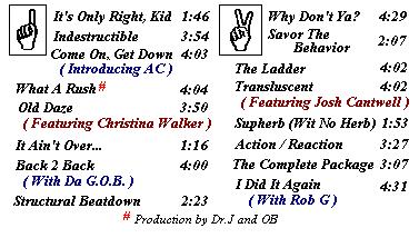 There is a lot going on in this tape. Christina (my girlfriend at the time) makes her first appearence on this tape and sings her ass off on Old Daze (my token "reminisce" track). She's got some nice pipes. AC (roommate at the time) also debuts here (Come On, Get Down) as well. He can actually freestyle and I wanted to bring in his humorous style and flow into the album. It worked well, cuz we were actually friends at the time. Heh. Rob G does his usual one song and drops a gem on 'em in I Did It Again. Josh Cantwell comes through again and does some backing vocals on Transluscent, which ended up not being all that memorable. Not his fault, though. Dr. J didn't do any vocals on this one, but his presence is felt. We produced What a Rush, straight from scratch. It was amazing how we did it... I got ahold of the CD called Classic Beats and Breaks, and we took one of the breaks, looped it on his Midi computer; we took the bassline from The Roots' Swept Away, and sampled Craig Mack from Get Down - plus Jay did some drum work on his TR707 and added that in. The result : a song! No Casio keyboard bullshit, either. Unfortunately, the song ended up a little on the slow side, and