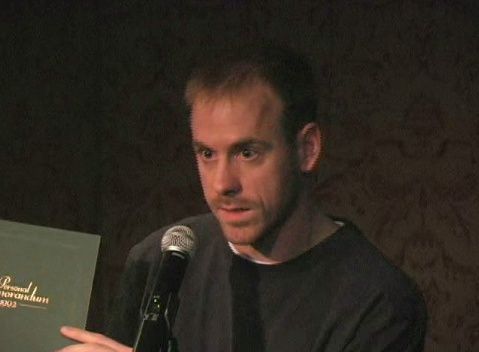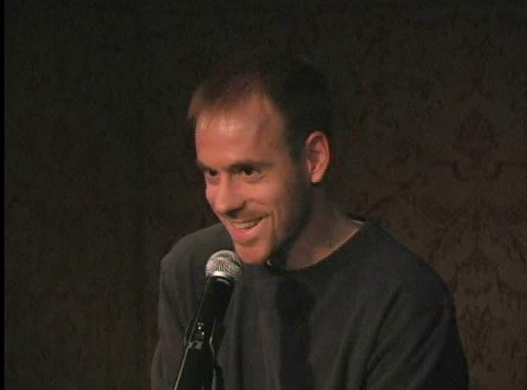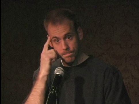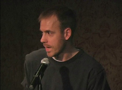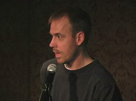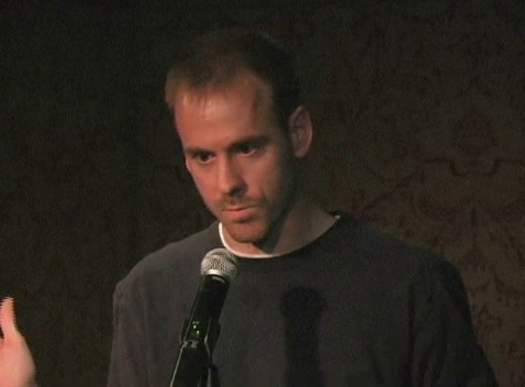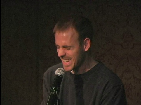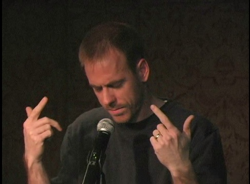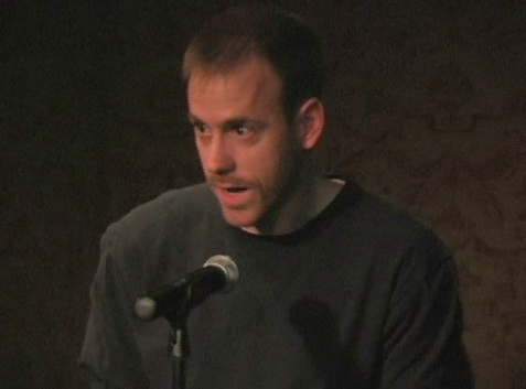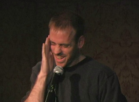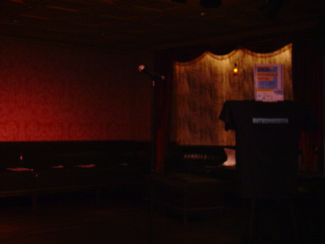 I'd never been to a slam before, but had read about it a little bit online (they're put on by First Person Arts) and sorta knew what to kinda expect. I'd never been to the venue before, either, and here's a picture of the stage. It was super dark and this picture sucks, but it's the only shot we got of the night. The camera was giving Steph trouble when I went on and all of hers were black. Luckily, a fantastic website called uwishunu.com videotapes all of the slams and puts all of the stories online, for free. I videotaped it myself, too, of course, but their's was much better. I grabbed a boatload of video-captures of it so I could have "pictures", and that's where the rest of these come from...