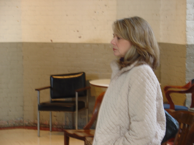 We went down and paused on the second floor in front of the rear staircase, where I "lagged behind" a bit to take this crappy picture. You can see my dad on the far left (hand on rail), Tristan (yellow-hooded sweatshirt sticking out) and my mom on the right (in jeans with cream-colored coat). Steph is next to Tristan but you can't see her. Our crackpot guide is in the middle.