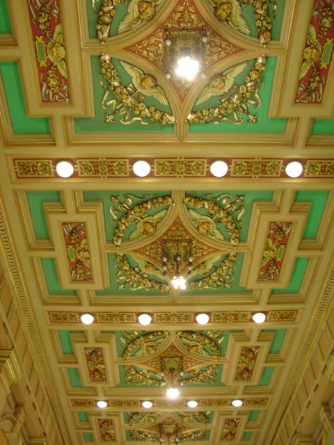 We waited for our tour to begin in their library, and it had some awesome artifacts (including a piece of the original wooden coffin that housed George Washington's body. creepy!) and a lot of stuff about Benjamin Franklin. Both Washington and Franklin were masons. Still didn't quite figure out what exactly that meant by just hanging out in the library. The range of their collection was crazy, from ancient gavels to centuries-old books to fine china to swords and all kindsa shit. We finally were summoned for our tour by our guide, who was incidentally the guy who we bought our tickets from. I thought he was just the ticket guy. (He gave us the family discount, which I didn't know existed, and it saved me $17!) Our tour began in a room adjacent to the library, and this picture is of the super-elaborate ceiling. Damn.