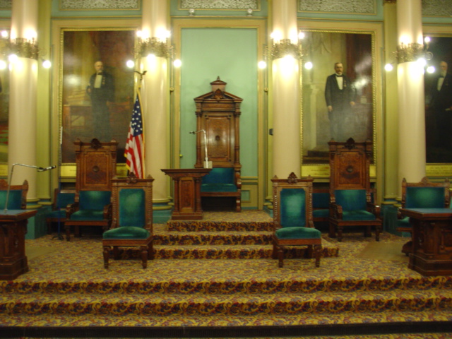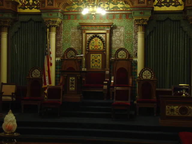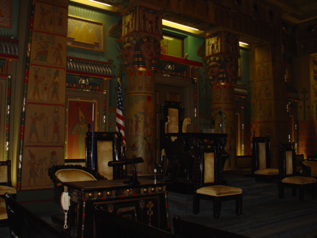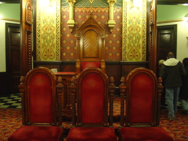 Each of the halls has its own theme. But each room is identical in structure except for the decor. They each have the same purpose, in that each is just a different version of the same room for any Freemason meeting or ceremony; they're called Lodge Rooms. On one end of the room is a set of seven special chairs where the head honchos sit. And I think the secretary and treasurer sit at the chairs that have desks.