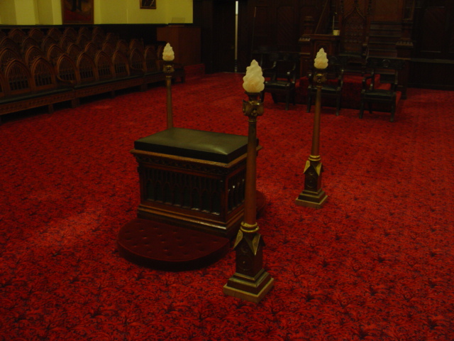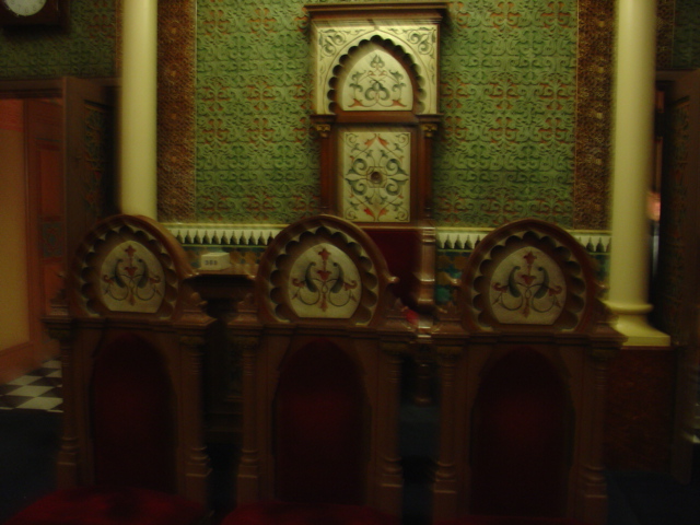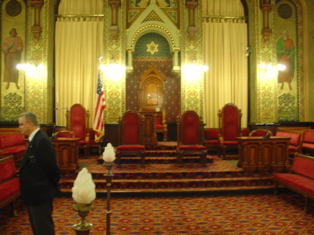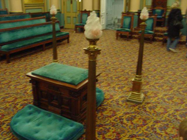 This is a picture of Gothic Hall, on the third floor. I think it was my favorite room. This structure is in the middle of each room. It has a three-pronged torch-thingy (each one standing for something) and a small table which is used for kneeling. I think that's how you get initiated. Each room also has a set of pews on each side, for general members to sit (seen here on the left). Gothic's special set of 4 chairs is in the upper part of this photo (the super-special set of 7 would then be on the other end). All the furniture in Gothic was hand carved. Craziness. Also probably my sharpest photo of the bunch.