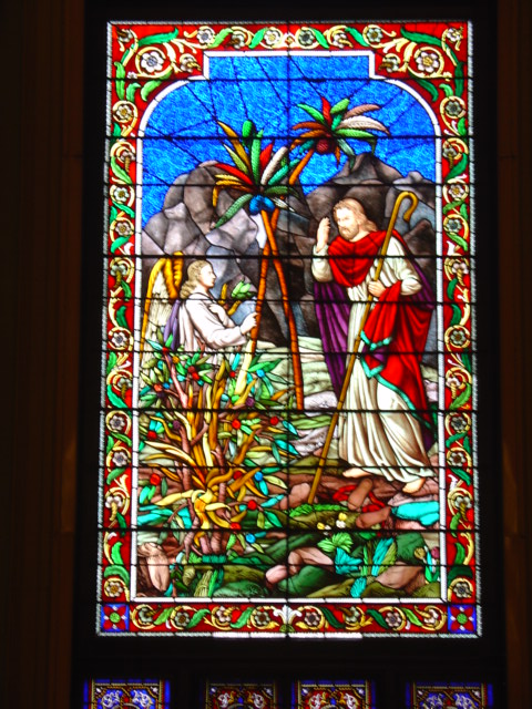 At the west end of the second floor above the Grand Staircase is this crazy stained glass ensemble. It faces Broad Street, and I quote: "depicts Holy Ground and the Burning Bush when Moses received the Ten Commandments from God. At the top is a traditional rose window, with the many emblems of the Masonic Fraternity." OK, then. I took a close-up of the window later on.
