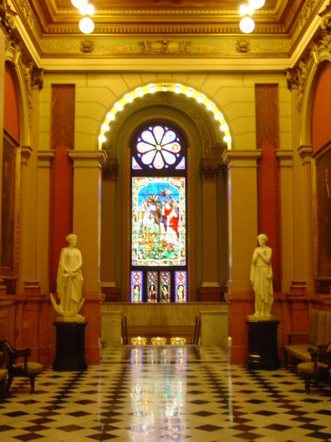 On the other end of each room is a set of 4 chairs. I forget who sits there; some other important members. These are from Oriental Hall, decorated in 1896. The other themed rooms: Gothic, Ionic, Egyptian, Norman, Corinthian and Renaissance. We found out shortly into the tour that each guide is in fact a Mason himself. And that it's essentially a big club of dudes who like to talk. No women allowed. They're not allowed to discuss politics or religion. So, basically they just talk about chicks. Not really. They have some kind of secret initiation ceremony or some other secrets of some kind. He didn't make a big deal about it. A quote I saw online stated that "It's not a secret society, but a society with secrets." Alrighty. You can read below the last picture for much more information on what a Mason is.
