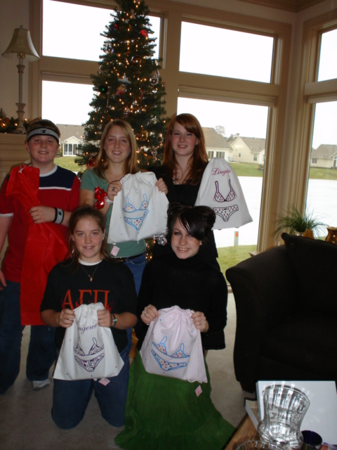 Here we all are (sadly missing Tristan, who was at his dad's) in front of Aunt Gail's tree, photo by Uncle Barry!