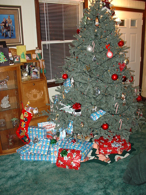 A fine tree, though rather large, and funny-looking with the flash on. Mostly Tristan's gear in the foreground, more of Steph and my presents around the other side. Dig the sweet family photo in upper-left.