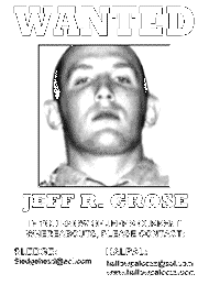 October 29, 1999It hurts that we've been forced to move on without Jeff, but it was time to start again. I know that we had planned to start up again a number of times, but for whatever reason, this has not happened. Jeff's such a transient that he's hard to keep tabs on. At this time, I have no idea where he is. If anyone out there does, drop me a line, please! We need him immensely to fill in the gaps... it just ain't SLeDGE without Grose.