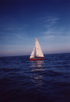 Ocean Sailing & The Attack of the Stingray... And on a brighter note, the weather was perfect for sailing that day, so Tom and Neal ventured out on to the Atlantic in search of the three mile limit. Many dolphin sightings were made. Others from our merry crew watched from the beach. Launching the boat proved easier than coasting back in on the surf, so when it came time to change crew one would swim out from the beach to the boat to take one of the two persons on the boat's place. Kevin was the first to make the 50 yard lap. However, his proved to be the most harrowing. Having swam half the distance Kevin decided to rest on the sand bar only to step on something that moved. Poor Kevin swam for dear life to the boat screaming "ray...killer ray!"
