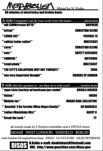 エレクトロニカのみのミックステープって一回作ってみたかったけど需要がおそろしく少ない+みんな眠っちゃうということでなかなか作らなかった。でも最近やたらと単調化してるエレクトロニカのシーンを見る限り、しばらく鳥肌が立つようなものも出なさそうなので、ここで〆ってことでよいものを集めました。けっこう30分流しで作ってみたところ、日本人が誰1人として入らず、同じアーティストが何回か登場するとこを見ると、自分がぞっこんしてる人がだいたい分かるはず。(笑!)。けっこう、基本としてオウテカは昔の曲で、それ以外はけっこう最近のです。B面は全然打って変わってブロークンビーツ。西ロンドンのシーンをかじってみましました。前回にハウス、ガラージを総ナメしたので今回はハウスの変化形を聴かせます。このブロークン・ビーツには最近本当に惚れ込んでるですが、自分の新たな武器となるかはまだ分かりません。(笑!)普段ジャズを弾くものとしての視点からだとACID JAZZ以来の正しいCLUB JAZZのような気がしてバンドで生音でやったりしたい!!と思う反面、DJの視点からだと、やたらと変則ビートなので繋ぎにくいってとこが本音です。 |