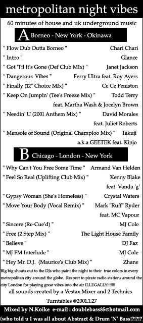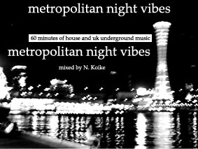 | metropolitan night vibesけっこう最近の異色的な動きとして4つ打ちに回帰しつつあります。なんていうか踊ることの楽しさというか、そういうものを再び掘り起こす的な意味でハウスをミックスしました。ダンサーの友達にハウスでなんか踊れるやつを作ってというリクエストがあって、後押しされ、このページではまったく取り上げてないような曲ばっかがミックスされてます。ほとんどが家で眠ってたようなレコードばっかですが、このテープ作るために、久々にハウスの新譜の方も漁ってみました。また前から本当の2STEPはアンダーグラウンドにある!海賊ラジオにある!と散々言いまくってましたので、UK SPEED GARAGEとはなんぞやということで、オバー、アンダーグラウンドとわずいい曲を入れてみました。今の日本のハウスシーンを回してるDJに本当にソウルがある回し方をできる人はおそらく指で数えられるほどしかいないんじゃないでしょうか?そんな商業的な方向へ走りだしたハウスとは高1あたりでお別れしてました。