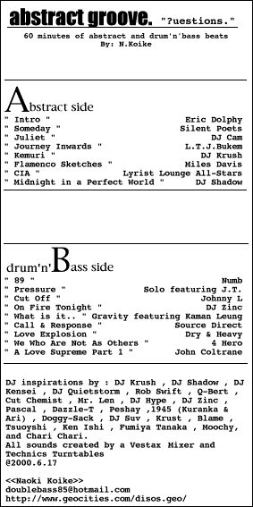 | abstract groove最近パッケージングまでこだわって作ったミックステープ。新旧こだわらず良い音づくしにしたつもり.....。A面アブストラクト、B面ドラムンベースの両刀使いテープ...(笑)...。それにしてもてテープは音が悪いなー.....。やっぱこれからの時代はMDでってつくづく思いました.....。自分で作ったヤツはツボにハマルにはそりゃとーぜんなんだけど、意外性は無いから飽きるなー.....。ほかの人のテープが聞きたい......。 |